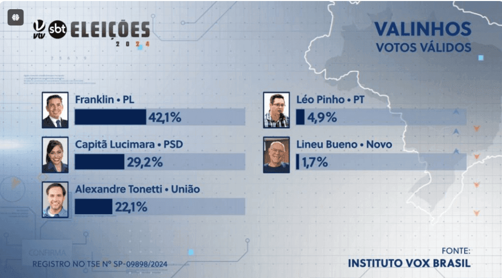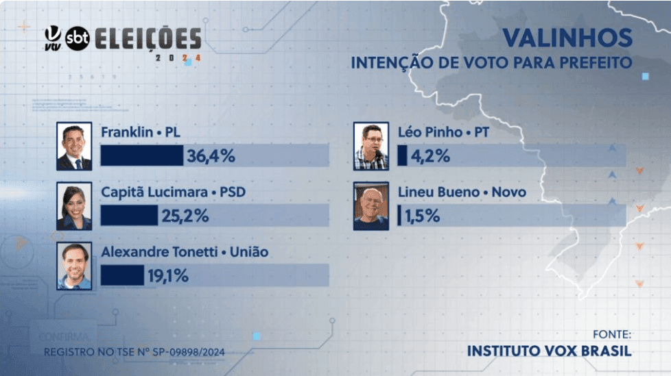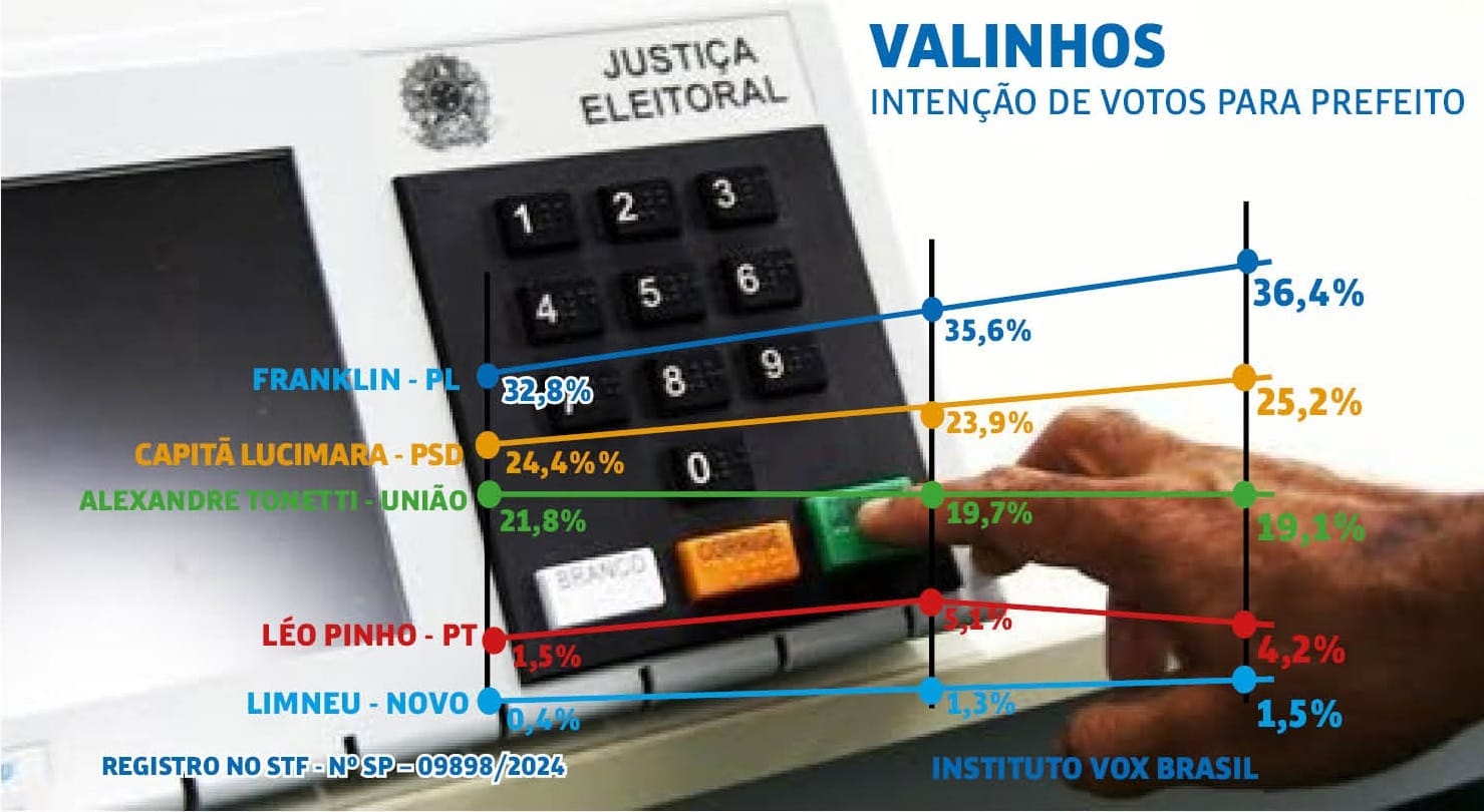 Em nova pesquisa divulgada pelo Instituto Vox Brasil Opinião e Pesquisas, Franklin (PL) aparece liderando a corrida eleitoral à Prefeitura de Valinhos com 42,1% dos votos válidos, seguido pela atual prefeita, Capitã Lucimara (PSD), que registra 29,2%. Alexandre Tonetti (União) surge em terceiro com 22,1%, enquanto Léo Pinho (PT) tem 4,9% e Lineu Bueno (Novo) aparece com 1,7%.