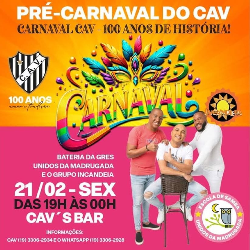 Em comemoração aos seus 100 anos de história, o Clube Atlético Valinhense (CAV) convida toda a comunidade para o Pré-Carnaval, que acontece nesta sexta-feira, dia 21, no CAV’S Bar. O evento contará com a animada bateria da GRES Unidos da Madrugada e a apresentação do Grupo Incandeia, prometendo uma noite repleta de alegria e muito samba.