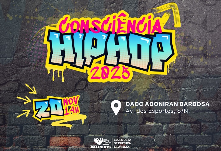 A iniciativa ocorre no CACC Adoniran Barbosa, a partir das 14h, e é organizada pela Prefeitura de Valinhos, por meio da Secretaria de Cultura e Turismo. A proposta é aproximar o público do universo hip hop e ampliar o acesso às expressões artísticas da cidade.