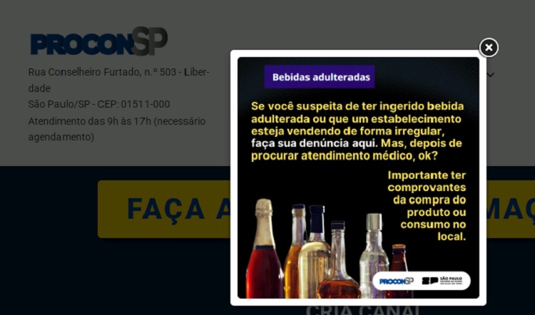 O Procon-SP criou um atalho em seu site para receber denúncias sobre bebidas suspeitas de adulteração. Foto: Reprodução