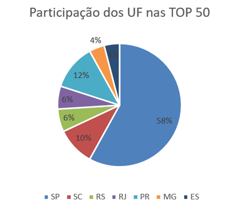 - 7 estados brasileiros têm cidades que figuram entre as 50 melhores, ou seja, apenas 26% dos estados estão presentes entre as 50+.