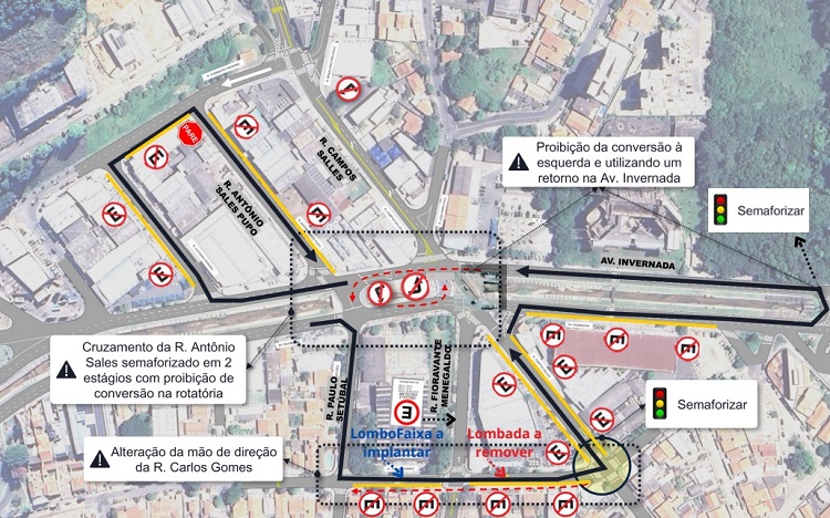 Já para quem sai da Vila Santana sentido Centro, a conversão à esquerda que dava acesso à Paulo Setúbal também será proibida. A alternativa será acessar a Rua Claudino Pereira, pegar a Humberto Frediani à direita e cruzar a Avenida Invernada pela Antônio Salles Pupo.