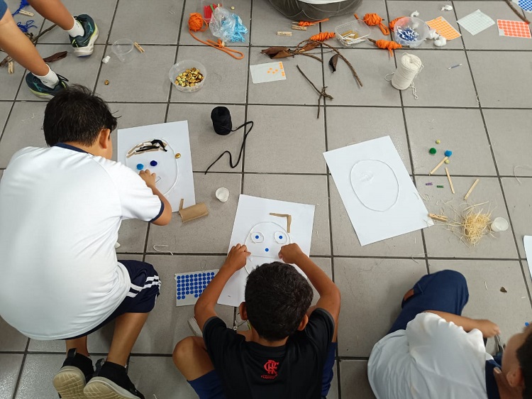 EMEB Dom Bosco (21/10 e 04/11): alunos do 4º ano exploraram livros digitais com autodescrição, enquanto o 1º ano fez uma “catança” de folhas e flores após observar uma obra fotográfica.