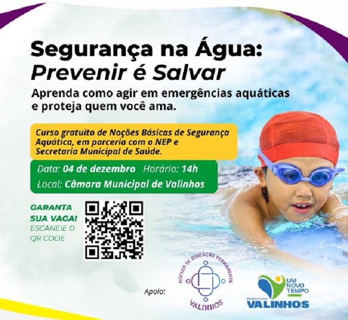 A Escola Legislativa de Valinhos (Eleva), da Câmara, oferece na quinta, 4, às 14h, o curso gratuito Segurança na Água: Prevenir é Salvar.
