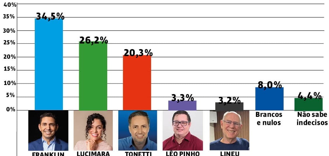 Pesquisa realizada pelo Instituto Paraná Pesquisas entre os dias 22 e 25 de setembro e divulgada na manhã desta quinta-feira, dia 26, pelo site da TV Band, mostra que Franklin (PL) lidera a corrida eleitoral à prefeitura de Valinhos com 34,5% das intenções de voto, no cenário estimulado. Em seguida, aparecem a atual prefeita Capitã Lucimara (PSD) com 26,2% e Alexandre Tonetti (União Brasil) com 20,3%.