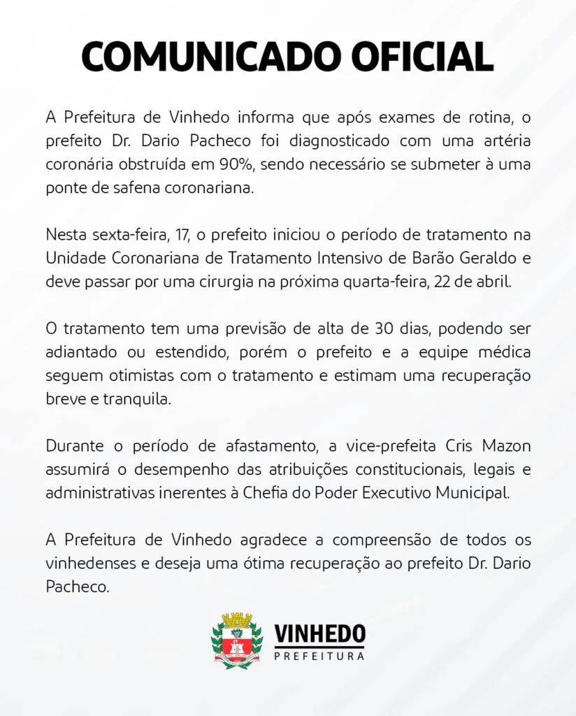 O prefeito de Vinhedo, Dr. Dario Pacheco, afastou-se temporariamente de suas funções na última sexta-feira (17) para submeter-se a um procedimento cirúrgico cardíaco. O ato oficial foi publicado em edição extra do Boletim Municipal, oficializando a transição temporária de comando para a vice-prefeita Cristina Maria Bordini Mazon.