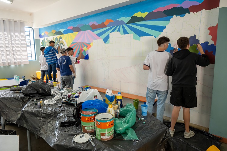Agora, a etapa final toma forma no pátio da escola: um mural de cerca de 20 m², criado coletivamente pelos alunos. O painel reúne símbolos, cores e histórias que representam tanto a comunidade escolar quanto a realidade do acampamento, onde muitos estudantes vivem.