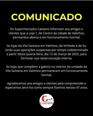 Em nota divulgada em suas redes sociais a diretoria dos Supermercados Caetano anunciou que a partir desta quarta-feira, dia 12, estará ‘suspendendo’ por tempo indeterminado as operações de suas lojas localizadas na Vila Sant’Ana e nos municípios de Vinhedo e de Itú.
