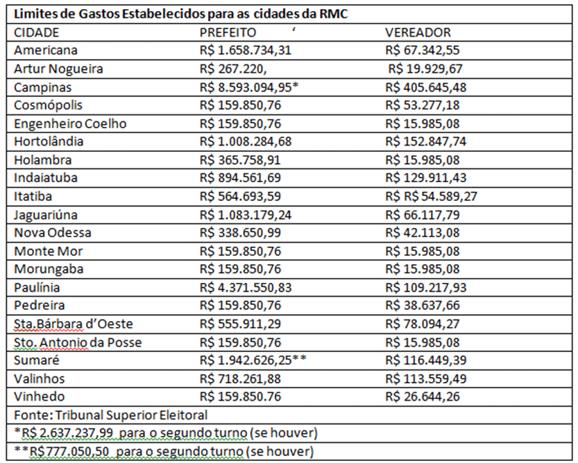 Na Região Meltripolitana de Campinas – RMC – Os candidatos a prefeito de Campinas terão um limite de gastos em R$ 8.593.094,95 para o primeiro turno e R$ 2.637.237,99 para o segundo turno (se houver); em Hortolândia um candidato a prefeito poderá gastar até R$ 1.008.284,68 e o candidato a vereador terá gasto fixado R$ 152.847,74; na cidade de Itatiba o limite ficado foi de R$ 564.693,59 para prefeito e R$ R$ 54.589,27 para vereador.