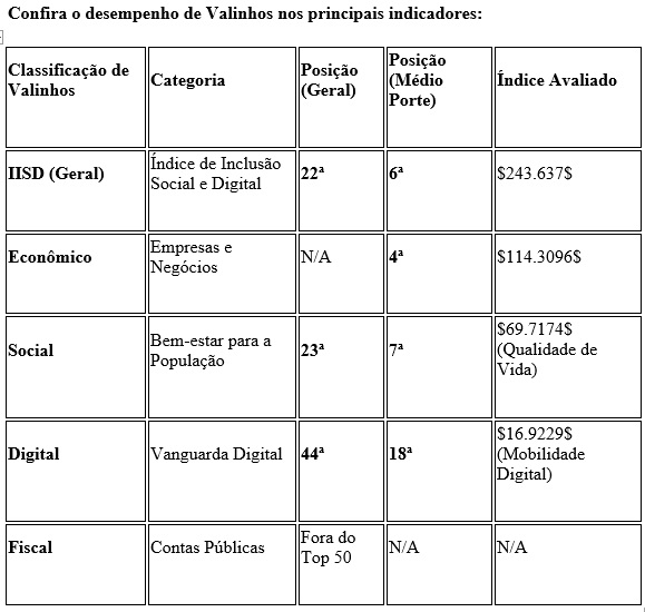 - Desempenho Econômico: Valinhos alcançou a 4ª posição entre os municípios de Médio Porte no índice de Empresas e Negócios, o que aponta para um ambiente altamente dinâmico para a abertura e manutenção de negócios.