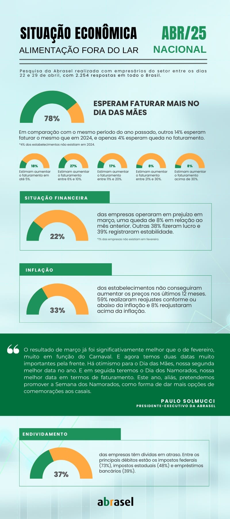 Pesquisa realizada em abril pela Abrasel revela que os estabelecimentos guardam boas expectativas para o Dia das Mães. Quase oito em cada dez estabelecimentos devem abrir no domingo, 11 de maio. Entre esses, 78% esperam faturar mais este ano do que na mesma data do ano passado, sendo que 62% esperam aumentar o faturamento até 20%. Além disso, 8% esperam aumentar entre 21% e 30%, e para 8% a alta pode passar de 30%. Outros 14% esperam faturar o mesmo que em 2024, e 4% acreditam que haverá queda no faturamento. Já 4% dos estabelecimentos não existiam em 2024 e não têm base para comparação.