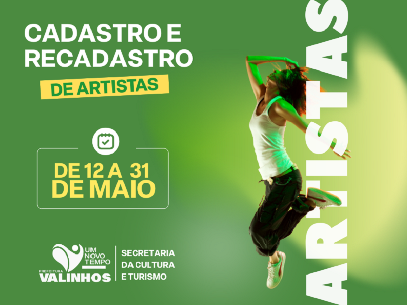 O prazo para o cadastro online, disponível no link vai de 12 a 31 de maio. A iniciativa busca fortalecer a cultura valinhense e ampliar o apoio aos artistas da cidade.