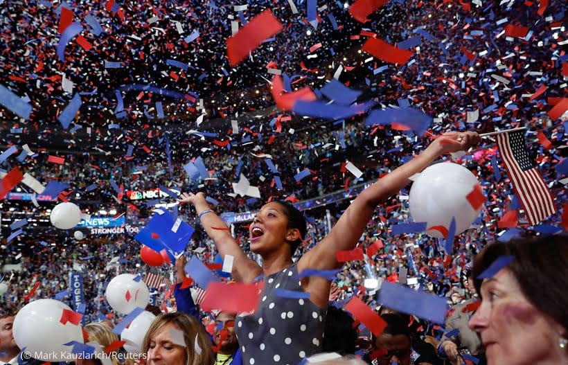 Mulher vibrando em meio a confetes e balões vermelhos, brancos e azuis (© Mark Kauzlarich/Reuters)