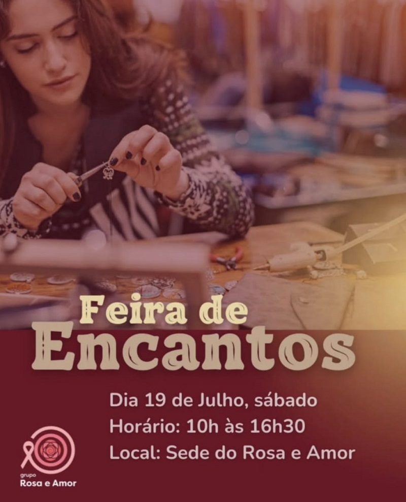 A Feira de Encantos acontece neste sábado, 19 de julho, das 10h às 16h30, na sede do Grupo Rosa e Amor — Av. Joaquim Alves Corrêa, 3855. A entrada é gratuita.