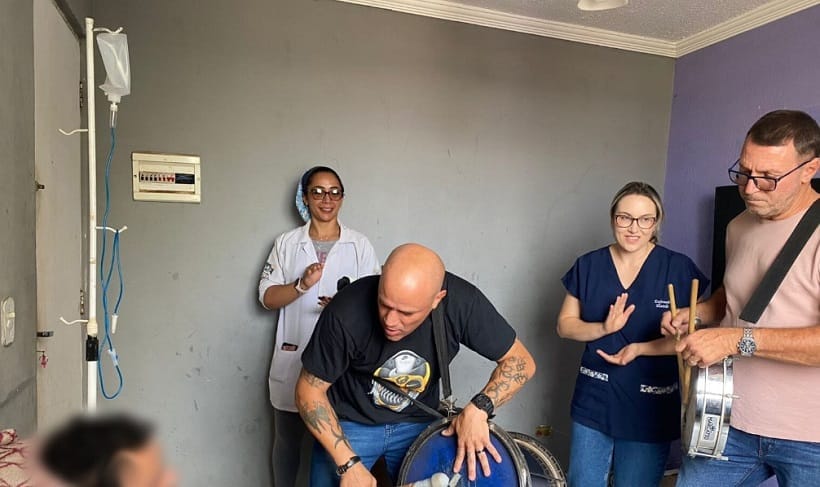 Durante a visita, o paciente ficou tão animado que tocou percussão junto com a equipe. “Foi um momento emocionante. Nós o estimulamos, e ele tocou com a gente. Cantamos para ele algumas músicas de samba. Esse projeto piloto em parceria com a Secretaria de Saúde é uma experiência muito gratificante, pois levamos alegria e música para os pacientes. Eles se emocionaram muito com as visitas”, destaca o servidor municipal Alexandre Amaro, coordenador do projeto de atividades adaptadas com percussão do DDH.