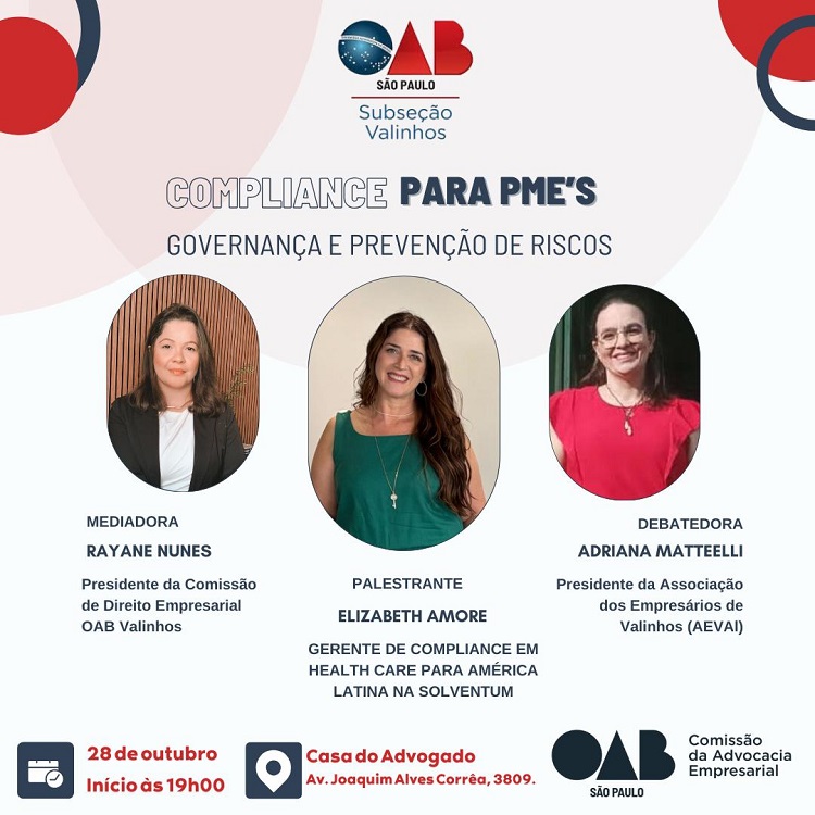 A OAB Valinhos realiza, no dia 28 de outubro, o painel “Compliance para PMEs: Governança e Prevenção de Riscos”, voltado para pequenas e médias empresas. O objetivo é aproximar o setor jurídico do empresarial e estimular debates sobre ética corporativa, gestão de riscos e boas práticas de governança.