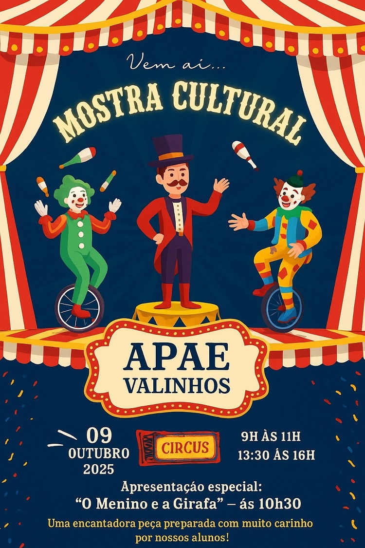 A Mostra Cultural APAE Valinhos Tecnologia acontece nesta quinta-feira, dia 9, com arte, criatividade e inclusão. Participe das vivências interativas e da peça “O Menino e a Girafa”