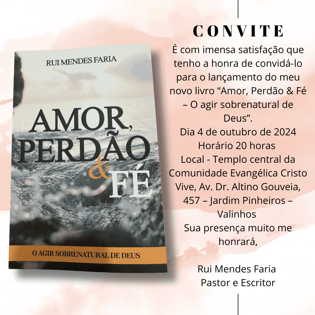 O pastor, escritor e terapeuta cristão Rui Mendes Faria, reconhecido por sua atuação em aconselhamento e por ser o fundador da abordagem Terapia Cognitiva Comportamental Cristã (THCCC), lança seu mais novo livro: “Infidelidade, Deslealdade – A raiz, os frutos e o caminho para a restauração”. A obra também é divulgada com o título “Infidelidade: A Cara do Hipócrita” e promete ser um material profundo, confrontador e, ao mesmo tempo, restaurador.