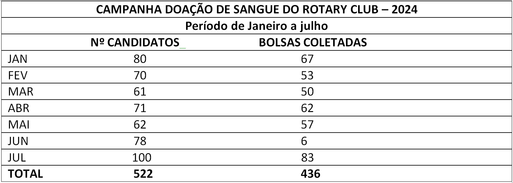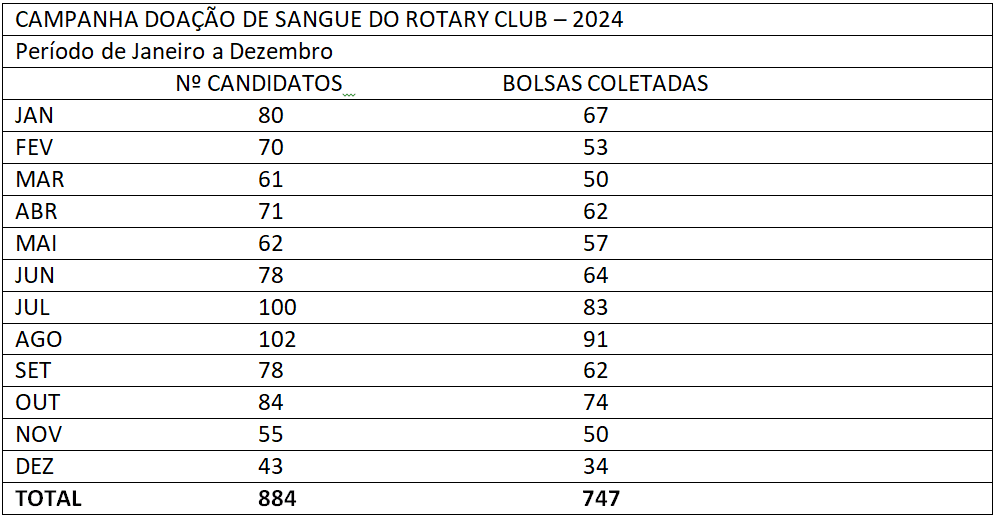Entre janeiro e dezembro de 2024, a Campanha de Doação do Rotary Club movimento 884 doadores e através deles foram coletadas 747 bolsas o que equivale a 336,15 litros de sangue, que foram suficientes para impactar e salvar 3096 vidas, uma média de 258 vidas por mês.