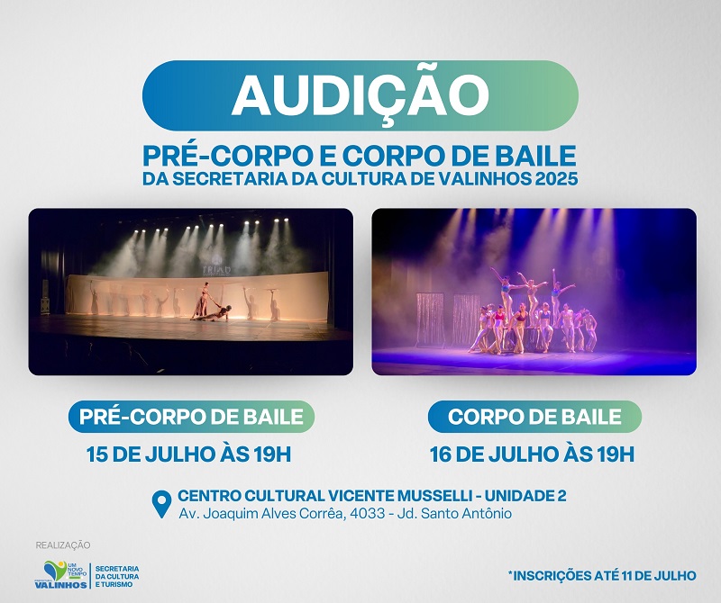 A Prefeitura de Valinhos, por meio da Secretaria de Cultura e Turismo, encerra nesta sexta-feira, dia 11, as inscrições para a seleção de novos bailarinos que vão passar a integrar o Corpo de Baile e o Pré-Corpo de Baile municipais. Os interessados podem se inscrever nas duas categorias, através do preenchimento de formulários.