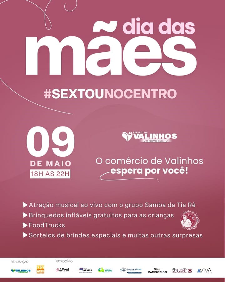O evento Sextou no Centro reuniu centenas de pessoas na última sexta-feira, dia 9, no centro de Valinhos. O trecho da Rua Antônio Carlos foi fechado ao trânsito entre a Rua Cândido Ferreira e a Avenida Sete de Setembro para as pessoas aproveitarem o comércio aberto até às 22h e as crianças brincarem nos brinquedos infláveis que tomaram conta da rua. No Largo São Sebastião também teve diversão com diversas opções de comidas e bebidas dos food trucks e muita música com o grupo Samba da Tia Rê.