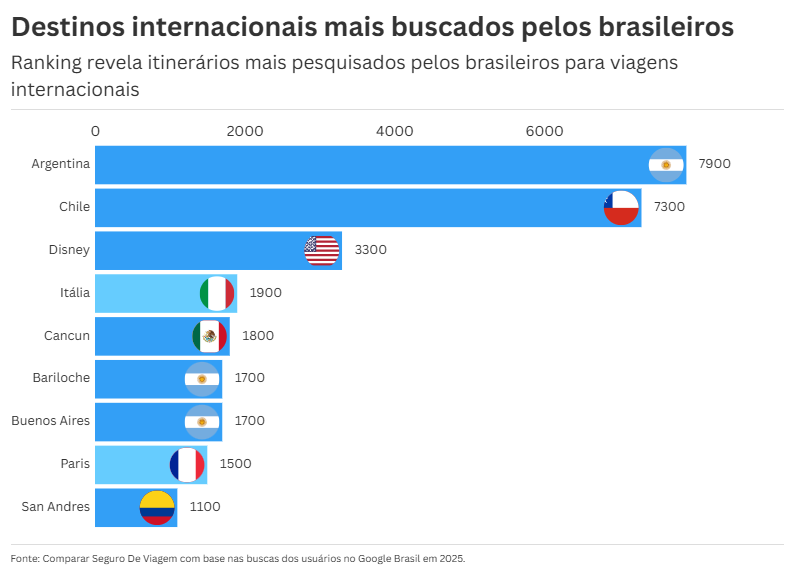 Diante deste cenário, a plataforma especializada em cotações de seguro-viagem Comparar Seguro de Viagem estudou o mercado para analisar quais são os países mais pesquisados pelos brasileiros quando pretendem viajar. Com base no volume de buscas feitas neste ano no Google, os dois destinos mais buscados foram Argentina e Chile.