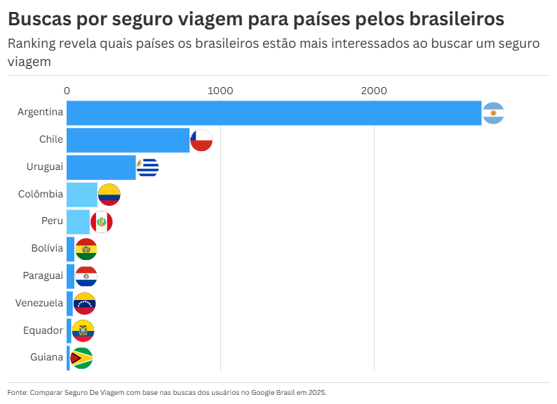 Mesmo nos locais em que o seguro não é um documento obrigatório para a entrada, esse recurso funciona como uma garantia, sobretudo para auxiliar durante imprevistos associados à saúde. Com um recorte de amostra da América do Sul, a Comparar Seguro de Viagem identificou, pela média mensal de buscas, os países mais procurados pelos viajantes brasileiros.