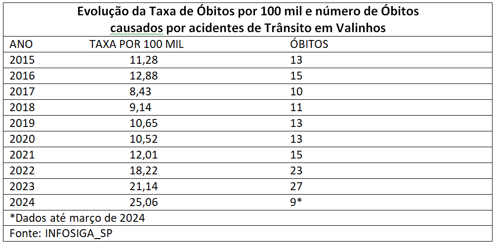Levantamento realizado pela Folha de Valinhos junto a base de dados do Sistema de Informações Gerenciais de Acidentes de Trânsito do Estado de São Paulo – INFOSIGA-SP – mostra que Valinhos é a 6ª cidade no estado de São Paulo com a maior taxa de óbitos causadas no trânsito por cada 100 mil habitantes – 21,14 por 100 mil e a primeira na Região Metropolitana de Campinas.